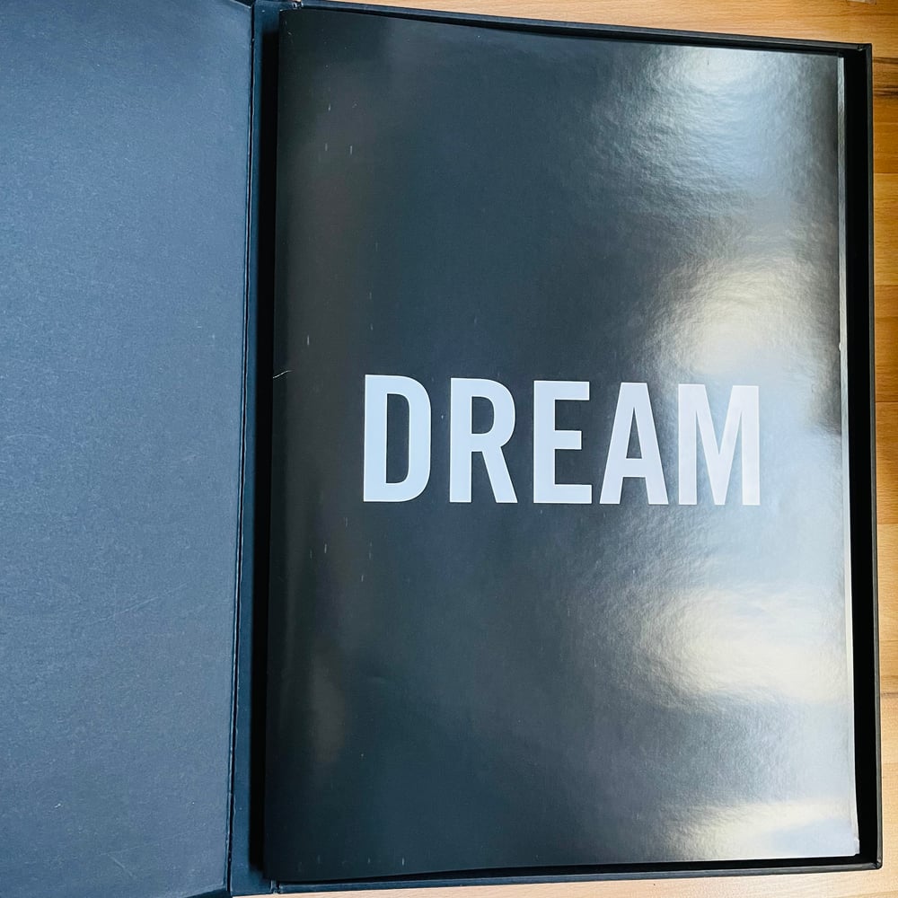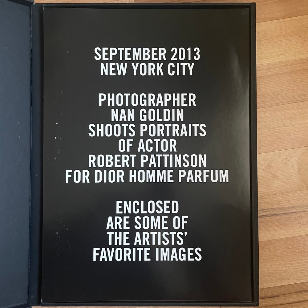 Robert Pattinson shot by Nan Goldin for the 2013 Dior Homme Parfum Campaign. 11 unbound posters are layered onto one another to form an oversized loose leaf book from this campaign. The reverse of each poster includes the quote “Dream as if you’ll live forever, live as if you’ll die today,” spelt out word by word. Enclosed in a black clamshell box.