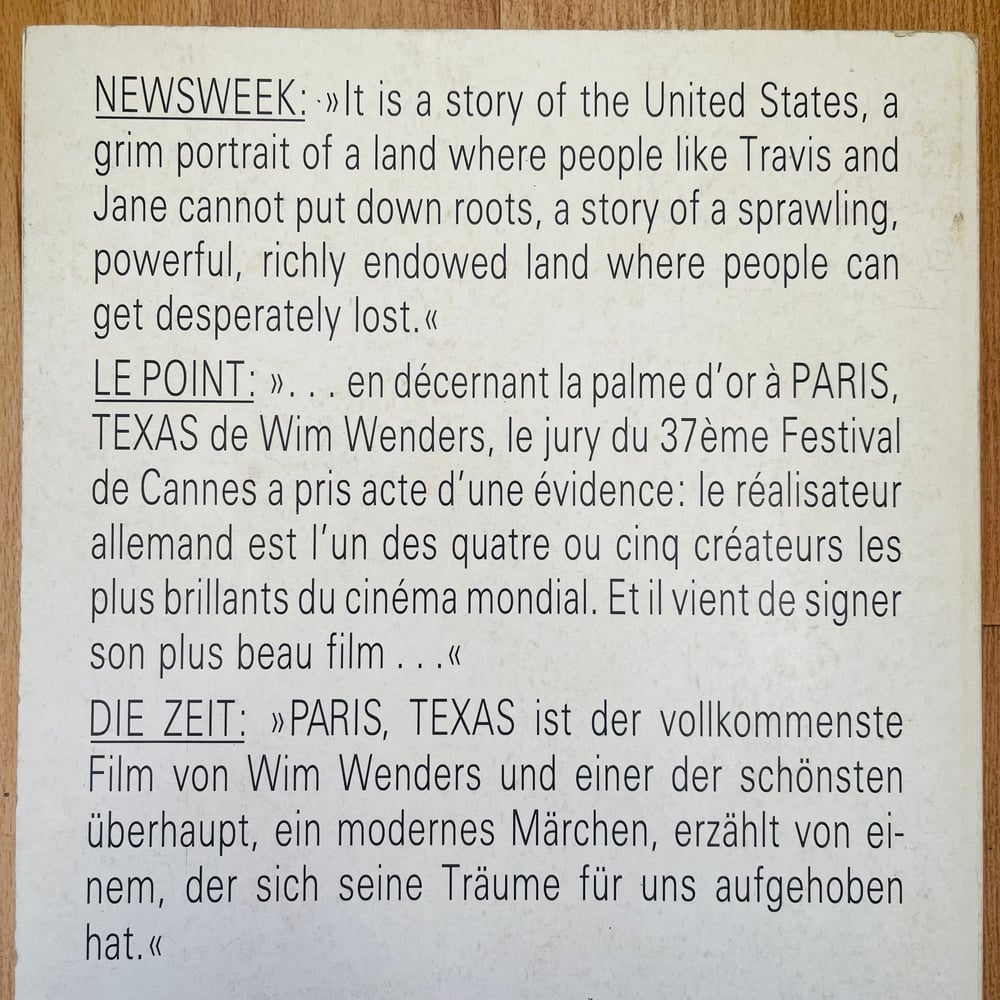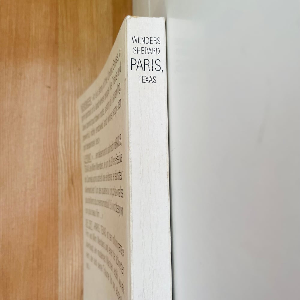 The Paris, Texas book merges the screenplay of the film with a 300-page portfolio of color images featuring the movie characters, the Texas landscape, old advertisement billboards, placards, graffiti, rusty iron carcasses, old railway lines, neon signs, motels, seemingly never-ending roads, and Los Angeles, finally culminating in some famous scenes shot outside a drive-through bank in Downtown Houston.